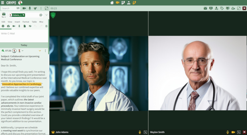 Medizinisches Fachpersonal kann direkt in CRYPE verschlüsselte Videokonsultationen mit Patienten oder Kollegen starten. Während der Sitzung können beide Seiten gleichzeitig ihre Bildschirme teilen – ideal für die gemeinsame Besprechung medizinischer Bilder oder Befunde in Echtzeit. Auch der sichere Dateitransfer ist während des Videoanrufs möglich.
