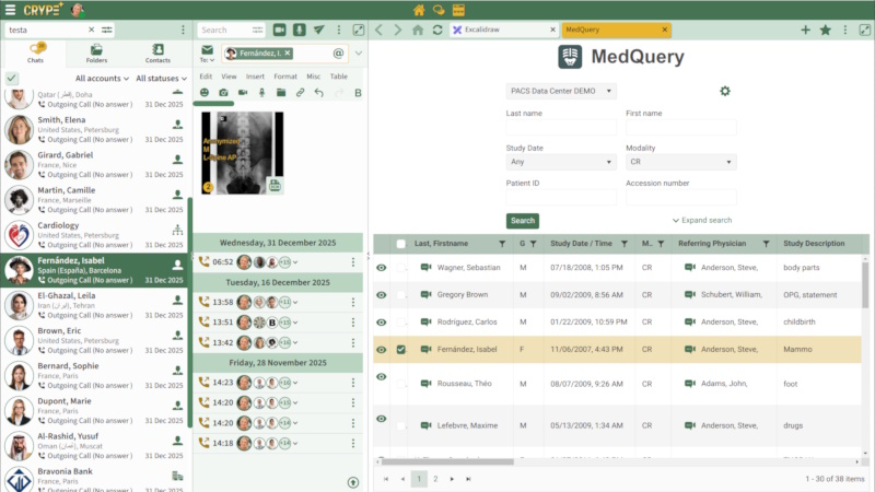 La aplicación del sistema MedQuery permite un acceso rápido y directo a los datos PACS radiológicos y cardiológicos, totalmente integrada en CRYPE.