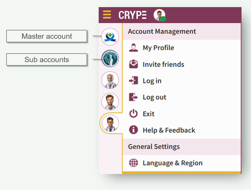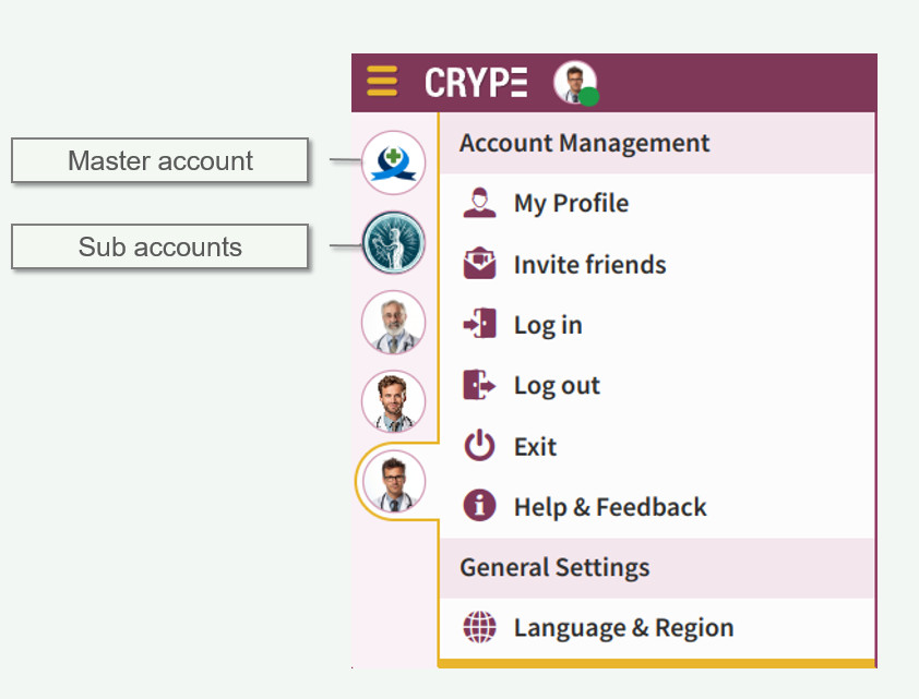 - Logging out or closing the app from the Master account automatically closes all Sub-accounts. However, CRYPE remembers the last login status of all accounts.