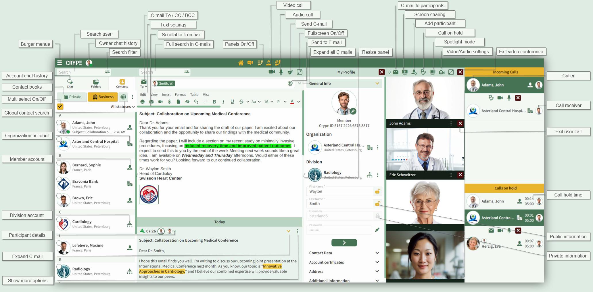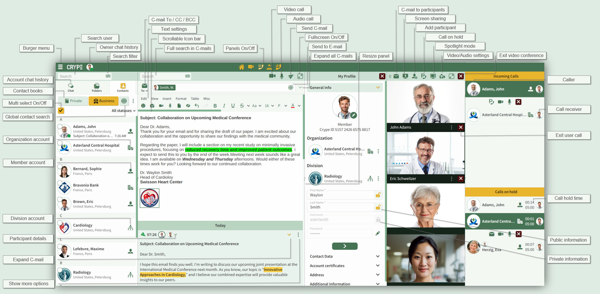Log in with multiple CRYPE accounts, manage incoming and outgoing C-mails or centrally receive or manage calls in the Call Manager Panel for all logged in accounts.